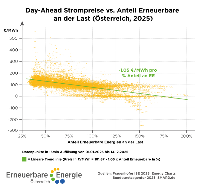 Die Auswertung aller Viertelstundenwerte des Jahres 2025 – vom 1. Jänner bis 14. Dezember – macht den Zusammenhang sichtbar: Steigt der Anteil erneuerbarer Stromproduktion, sinkt der Preis für elektrische Energie für den nächsten Tag.