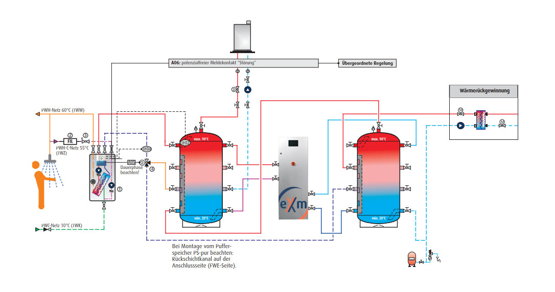 Die eXergiemaschine, die varmeco und ihr Schweizer Partner BMS-Energietechnik entwickelt haben, stellt eine optimierte Temperaturschichtung im Pufferspeicher (Heizspeicher) her. Dazu arbeitet im Inneren des Geräts eine Wasser-Wasser- Wärmepumpe mit Nennwärmeleistungen Qth von 3 bis 40 kW, die für eine große Temperaturspreizung von etwa 50K im Pufferspeicher ausgelegt ist und auch bei Quelltemperaturen von 55 °C und mehr arbeitet. Während des Betriebs entnimmt die eXergiemaschine über zwei Kreisläufe Wasser aus der Mitte des Speichersystems. Ein Kreislauf leitet Wasser zum Kondensator der Wärmepumpe, wo es erhitzt wird, bevor es in den heißen Teil des Speichers gelangt. Der andere Kreislauf führt über den Verdampfer und leitet das dort heruntergekühlte Wasser anschließend in den unteren, kalten Speicherbereich.