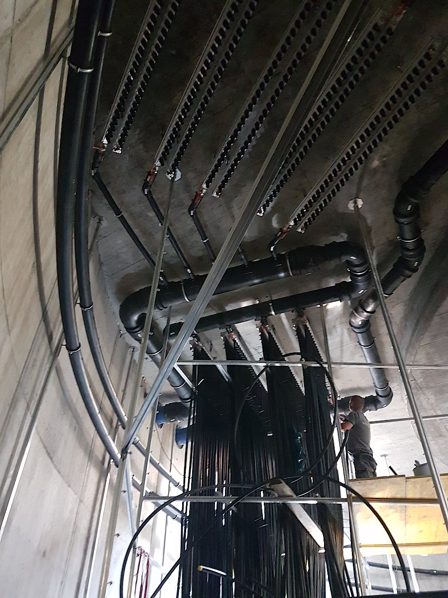 Durch die geringe Oberflächeneindringtiefe der Wärmequellenanlage besteht – im Gegensatz zu Tiefenbohrungen – keine Gefahr wertvolles Grundwasser zu verschmutzen. Der Eisspeicher wird komplett unter der Erdoberfläche vergraben und gilt genau genommen als ausgebauter Kellerraum. Eine spezielle Genehmigung des Baus wird deshalb nicht benötigt. Die von der TBH Ingenieur GmbH geplante Energieversorgung für das neue IKEA Logistikzentrum basiert auf einer Wärmepumpenanlage im Kellergeschoß des Gebäudes, welche sowohl zur Beheizung als auch zur Kühlung herangezogen werden kann. Für die Wärmepumpenanlage sind zwei Wärmequellen vorgesehen: Einerseits wird die Hydrothermie genutzt, bei der das relativ konstante Temperaturniveau des Grundwassers als Wärmequelle für die Wärmepumpenanlage genutzt wird. Andererseits wird ein, im Erdreich platzierter, Groß-Eisspeicher in Kombination mit unverglasten thermischen Kollektoren eingesetzt. Das Volumen des Eisspeichers fungiert als Wärmequelle für zwei Sole/Wasser-Wärmepumpen, welche das Temperaturniveau des Eisspeichers zur Beheizung nutzbar macht. Der Wärmeentzug führt zu einer vorschreitenden Vereisung des Speichervolumens, wobei eine Regeneration (Schmelzvorgang) einerseits durch Solarabsorber und andererseits durch das den Speicher umgebende Erdreich erfolgt. Beide Wärmepumpen versorgen einen zentralen Energiespeicher, der zur Spitzenlastreduktion und als Lastausgleichspeicher für Energieüberschüsse dient. Mit dem Groß-Eisspeichersystem kann aber eben nicht nur geheizt, sondern auch gekühlt werden. Die Kühlung erfolgt über einen Plattenwärmetauscher, welcher mit dem Regenerationswärmetauscher im Eis-Energiespeicher verbunden ist. Es kann sowohl durch Natural Cooling als auch durch Active Cooling gekühlt werden.