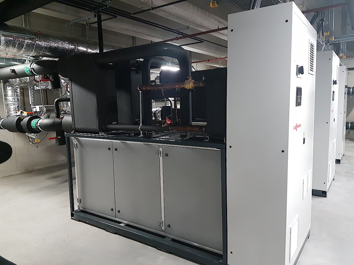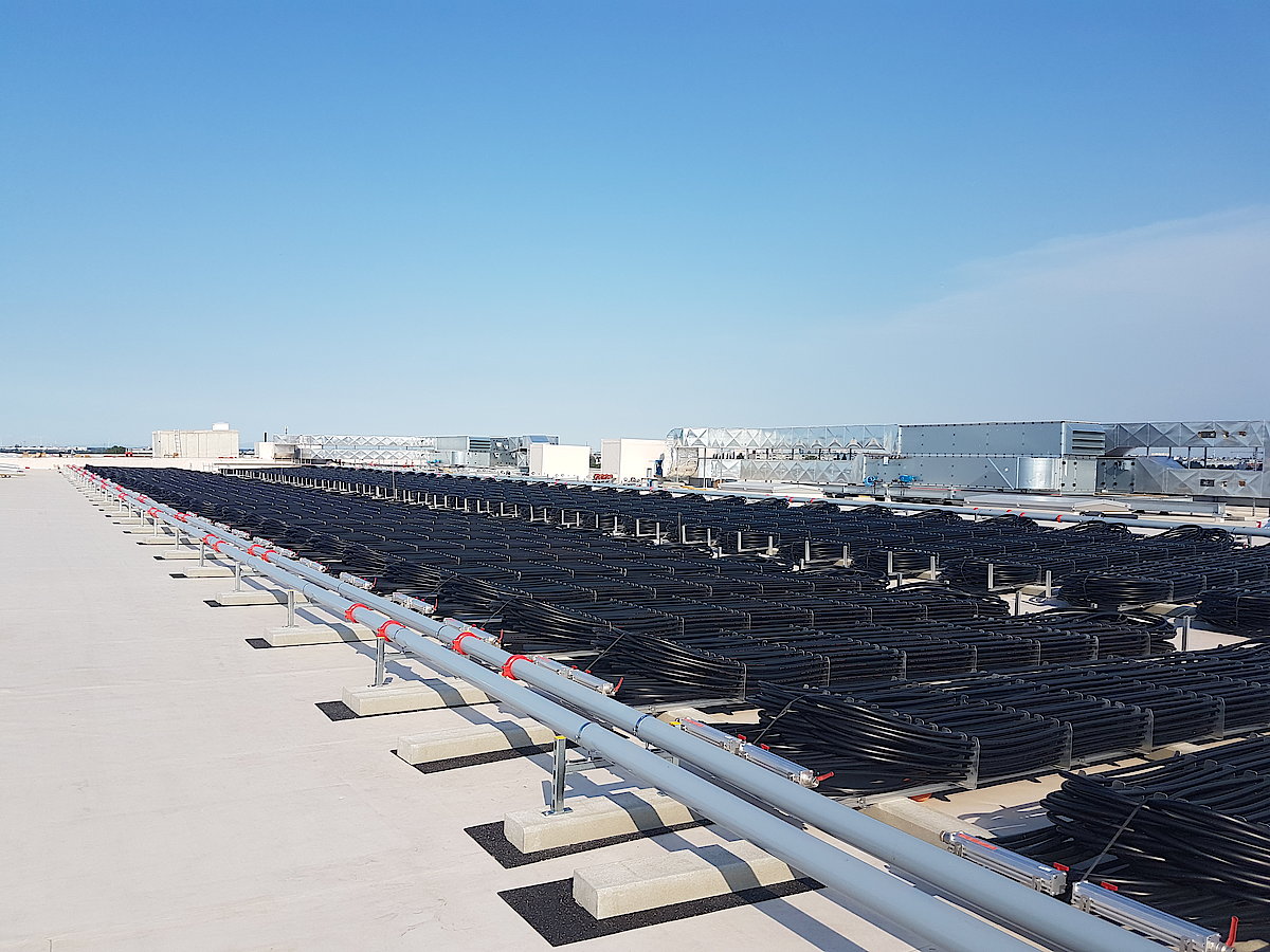 Für die elektrische Energieversorgung des Objekts entsteht am Dach des Gebäudes eine moderne Photovoltaikanlage mit einer Leistung von ca. 1 MWP. Die Anlage besteht aus 3350 Modulen und einer Fläche von rund 20.000m2, welche mit 15° aufgestellt und nach Süden ausgerichtet wird. Überschüssige Energie wird in das Netz der Wien Strom gespeist. Der Betonbehälter mit einem Volumen von 1700m3 beinhaltet den Entzugswärmetauscher mit 23km Rohrlänge und einer Leistung von 832kW. Über vier Ringleitungen wird Regenerationsenergie und Abwärme des Gebäudes in den äußeren Regenerationswärmetauscher eingebracht. Neben dem Eisspeicher stellen 172 Solar-Luft-Kollektoren genügend Sonnenenergie und Umgebungswärme für einen ganzjährigen Betrieb zur Verfügung. Mit 73km Rohrlänge am Dach ergibt sich somit genügend Oberfläche um eine ausreichende Quelle für die 1054kW Wärmepumpenleistung zu liefern.