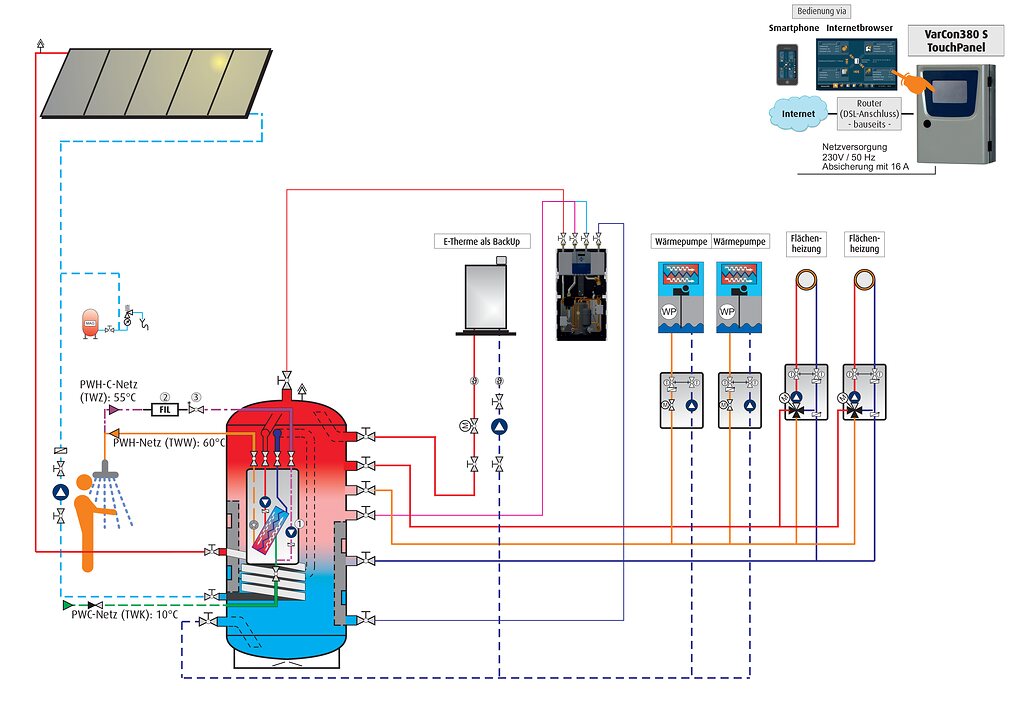 Alle Betriebszustände und Wärmeflüsse werden am Regler VarCon380 M oder in der Webanwendung VMS (Varmeco Management Server) dargestellt. Auch Fehlersuche oder Programmierung sind aus der Ferne möglich.